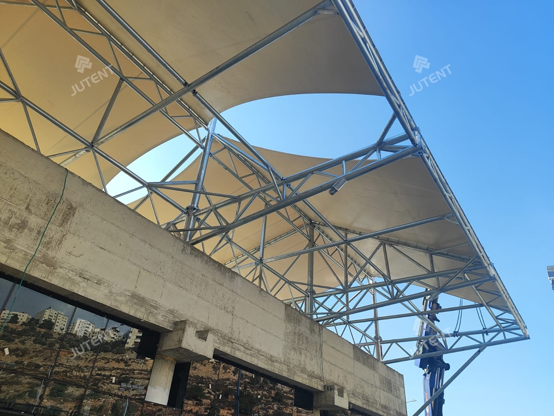 Football stadium grandstand tensile membrane canopy in Palestine, 2,500 m² PVDF roof with galvanized steel, providing durable sunshade and weather protection.