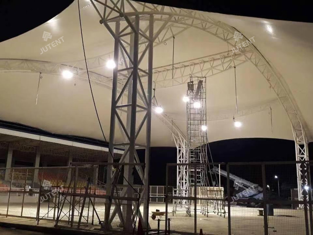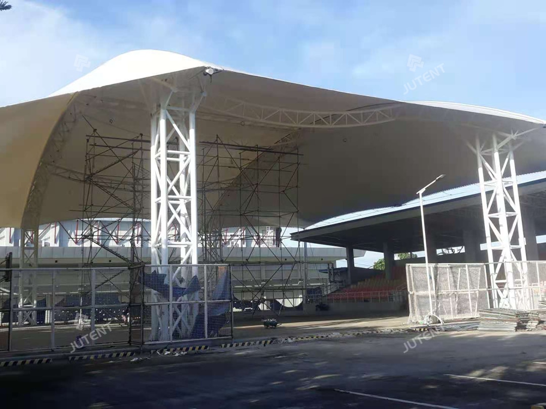 This project is located in Manila, Philippines, and was completed in March 2021. It is a large-span tensile membrane roofing system designed for a tennis sports complex. The canopy covers an overall dimension of approximately 60 m × 49 m, with a central height of about 13 m, providing a total projected coverage area of around 2,940 m². The primary structure adopts a steel frame system with a total steel consumption of approximately 39 tons. By utilizing a soft-edge tensile membrane structure, the overall steel usage is significantly reduced compared to conventional rigid roofing systems, improving structural efficiency and material economy. The steel structure is treated with epoxy zinc-rich primer and yellow topcoat, ensuring enhanced durability and corrosion resistance in a tropical climate. The roofing membrane is made of 1300 g/m² white PTFE architectural membrane, featuring B1 fire resistance, excellent self-cleaning performance, and a service life of 25–30 years, fully compliant with public building safety standards.