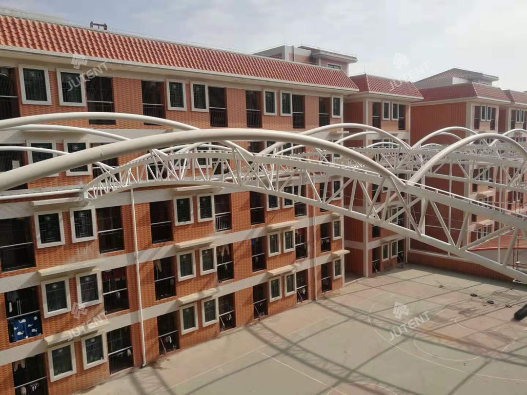 The client required a tensile membrane canopy for the basketball court located between the teaching building and student dormitory, primarily to provide effective sun and rain protection while integrating with the surrounding building structures. Based on these requirements, our designers developed an arched steel frame tensile membrane solution, with the structural frame anchored between the teaching and dormitory buildings to achieve both functional coverage and architectural integration.