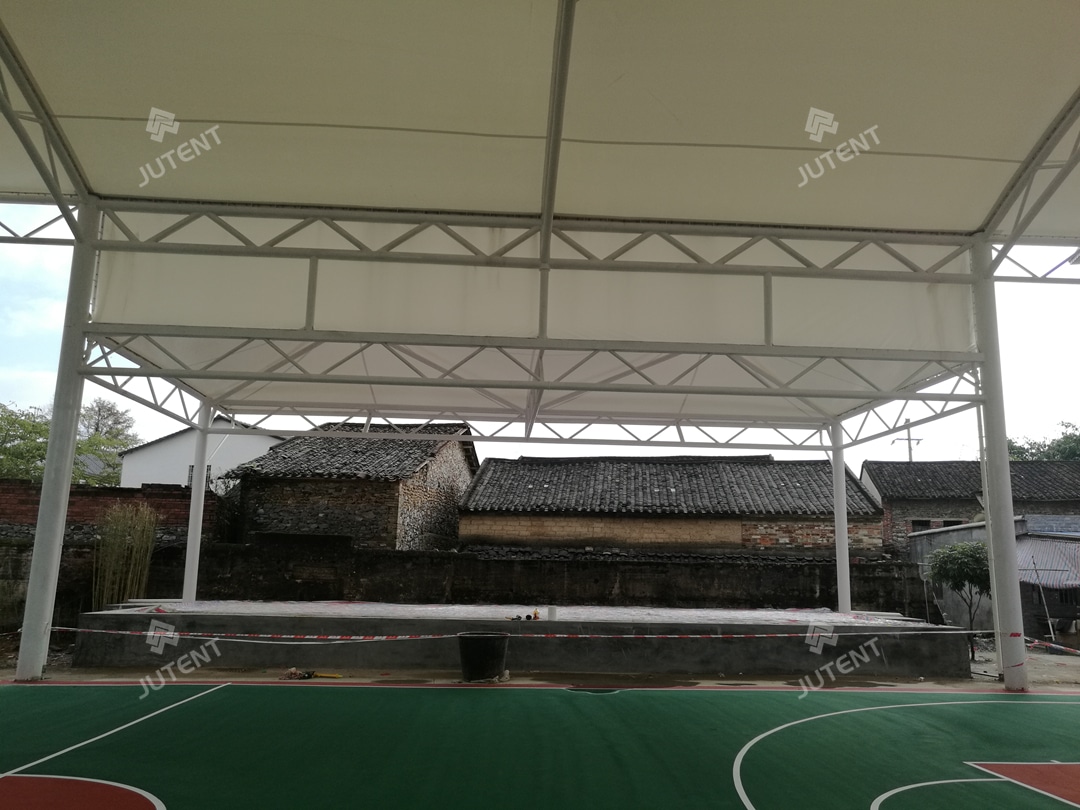 This project is in Yingde District, Qingyuan, Guangdong, China, and was finished in February 2024. The basketball court is 15 m × 28 m, and it is covered by a tensile fabric roof measuring 17 m × 32 m. Around 718 m² of membrane was used. The roof is made of white PVDF architectural fabric (1100 g/m²) and meets B1 fire safety standards. The project adopts a combined system of high-strength PVDF membrane and steel structure, guided by a design concept of lightweight construction, durability, and suitability for rural settings. The curved membrane form helps reduce wind load while creating a clean and modern visual identity that blends well with the village environment. As a result, the covered basketball court has become a central space for daily recreation, social interaction, and community activities, filling the gap for large outdoor cultural and sports facilities in the village.