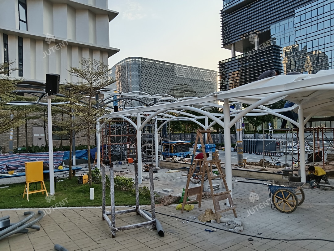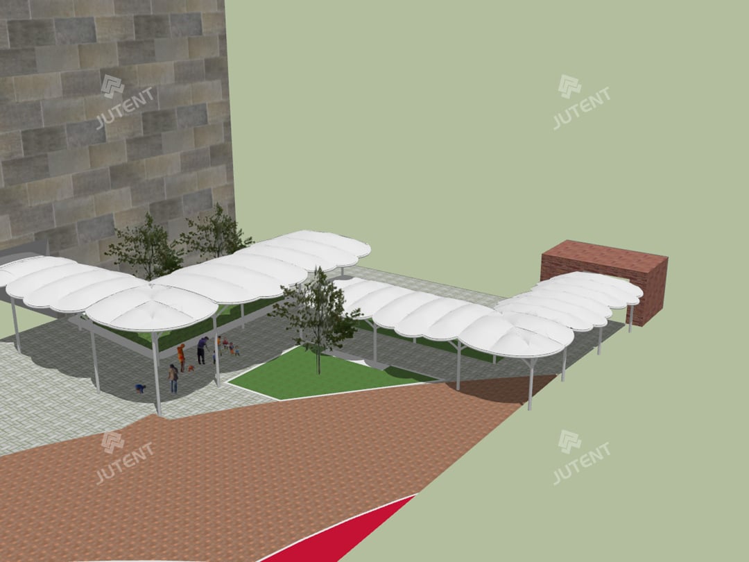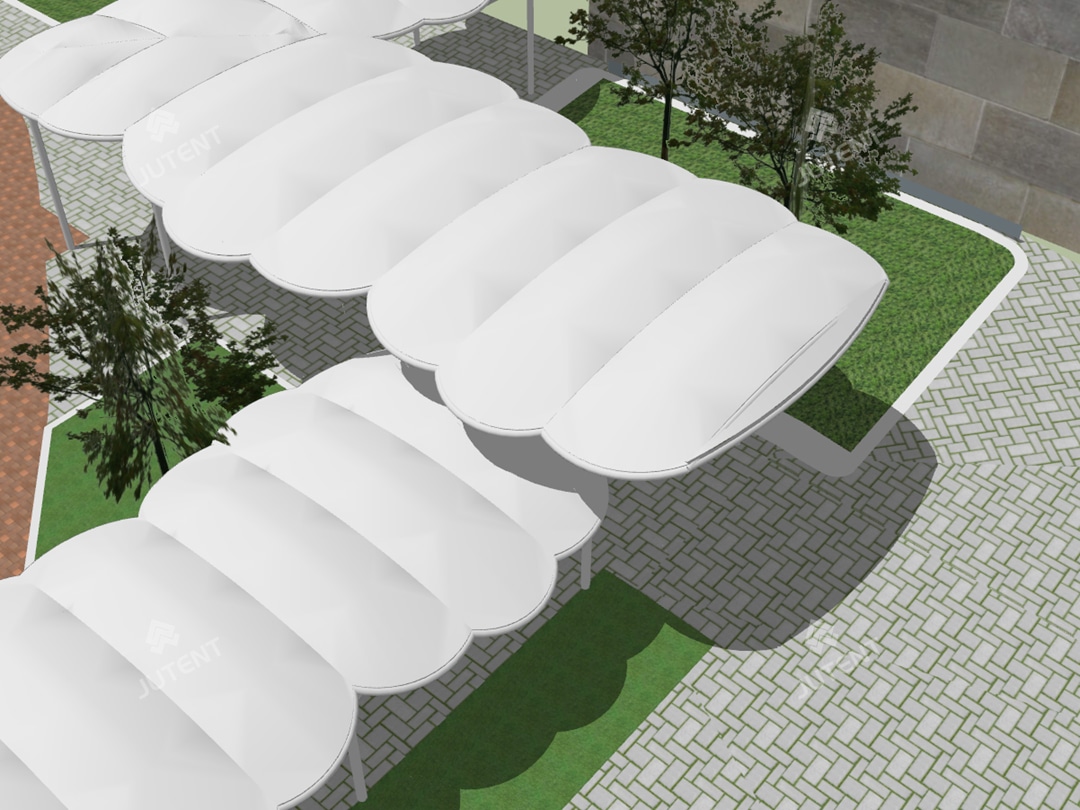 In response, our team proposed a biomimetic tensile membrane design featuring interconnected cloud-like forms. A unified white color scheme was applied to both the membrane and steel structure to ensure visual harmony with the surrounding environment. Comprehensive structural analysis and wind-load calculations were completed to guarantee safety and performance, and the final design was approved by the client.