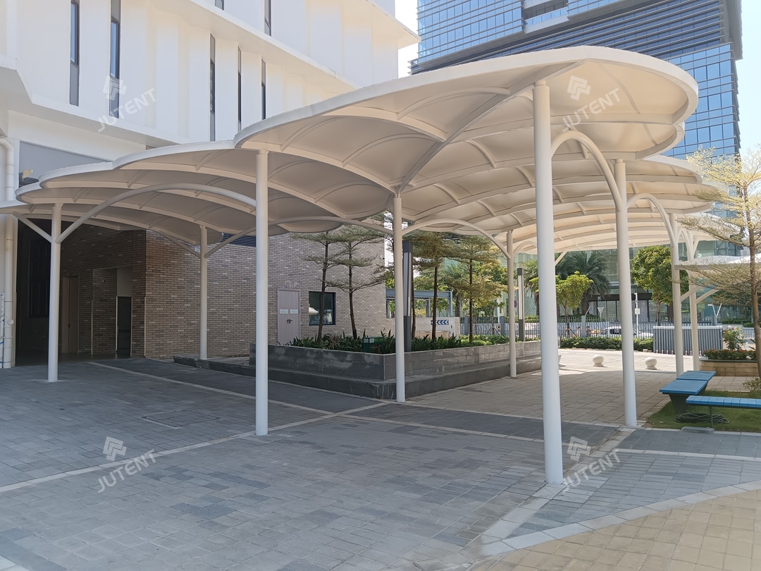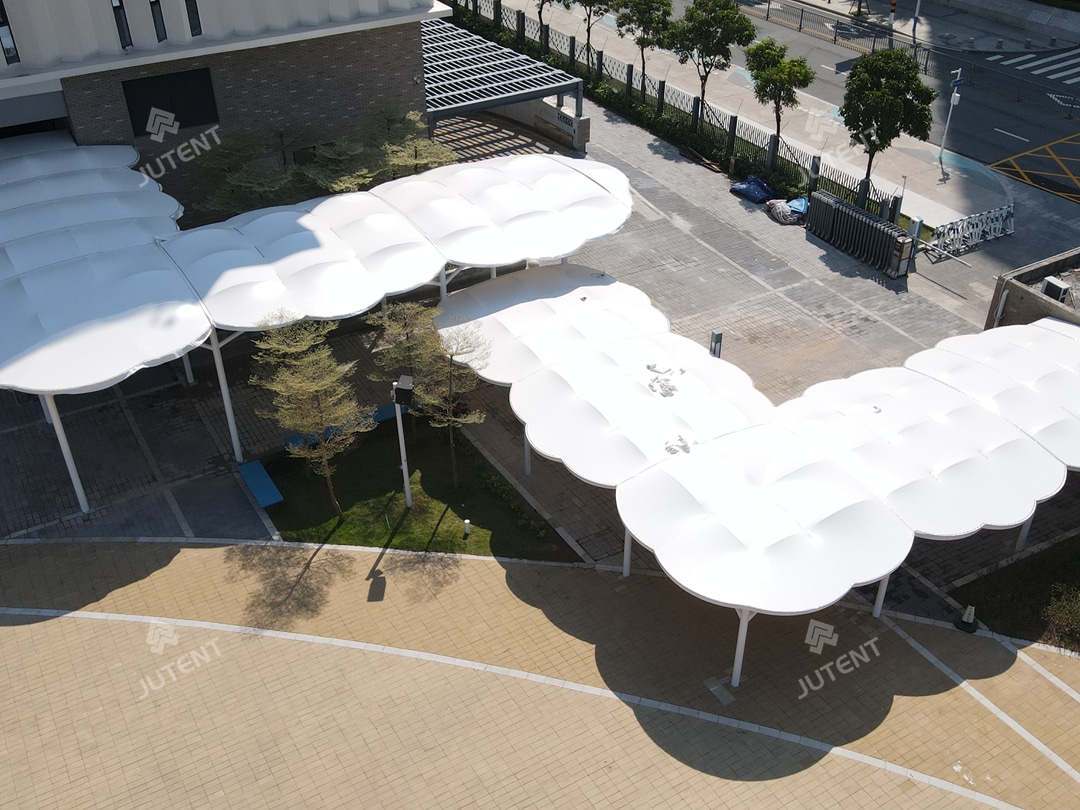 This project is located in Hengqin District, Zhuhai, China, and was completed in October 2024. It is a tensile membrane canopy system designed for school corridors, inspired by the organic form of “clouds.” The project was developed in two phases, with Phase I covering approximately 600 m² and Phase II approximately 800 m², for a total covered area of about 1,400 m². The structure has a standard width of 8 m and an overall height of approximately 2.8 m, with a total steel consumption of around 41 tons.