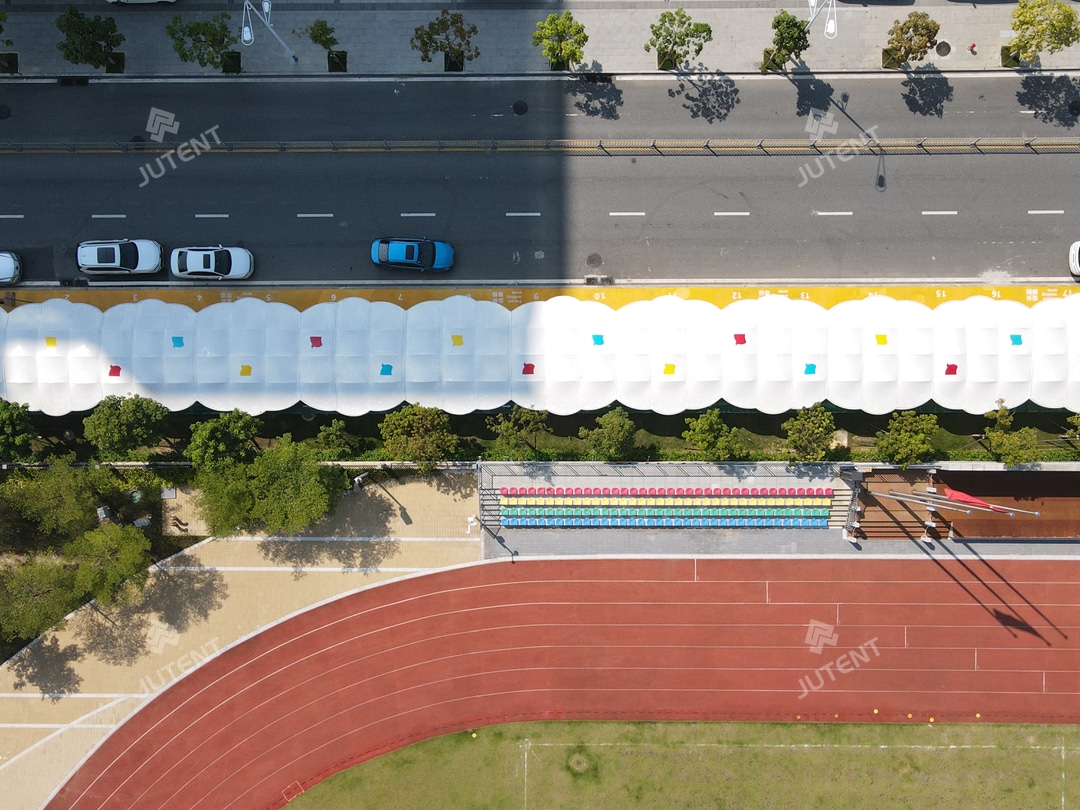 The primary steel structure is treated with an epoxy zinc-rich primer and white topcoat to ensure long-term durability and corrosion resistance. The roofing material is 1100 g/m² white PVDF architectural membrane, featuring B1-class fire resistance and fully compliant with public building safety standards.