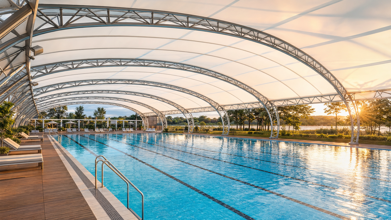 We design and fabricate corrosion-resistant tensile membrane enclosures for indoor swimming pools, aquatic centers, and resort facilities. Our factory-direct process ensures optimal ventilation and humidity control for a superior swimming environment.